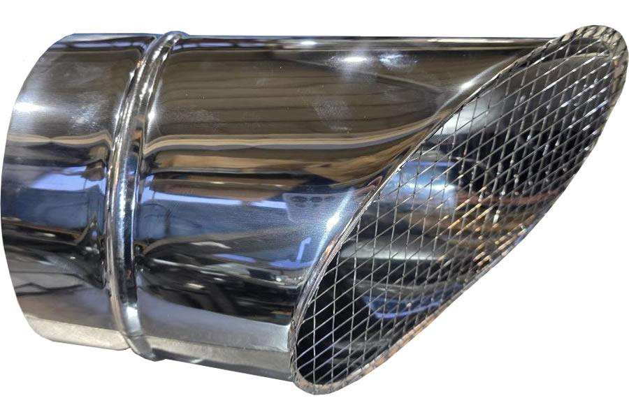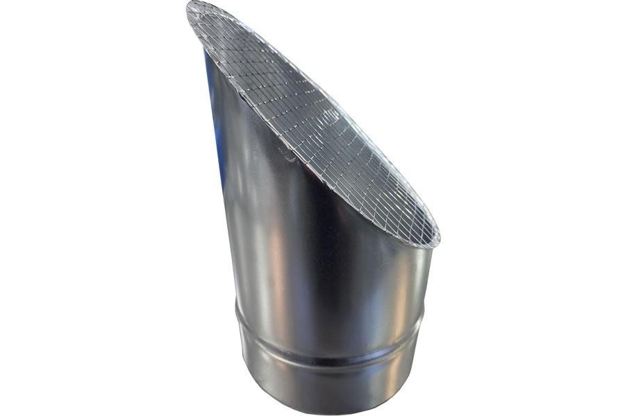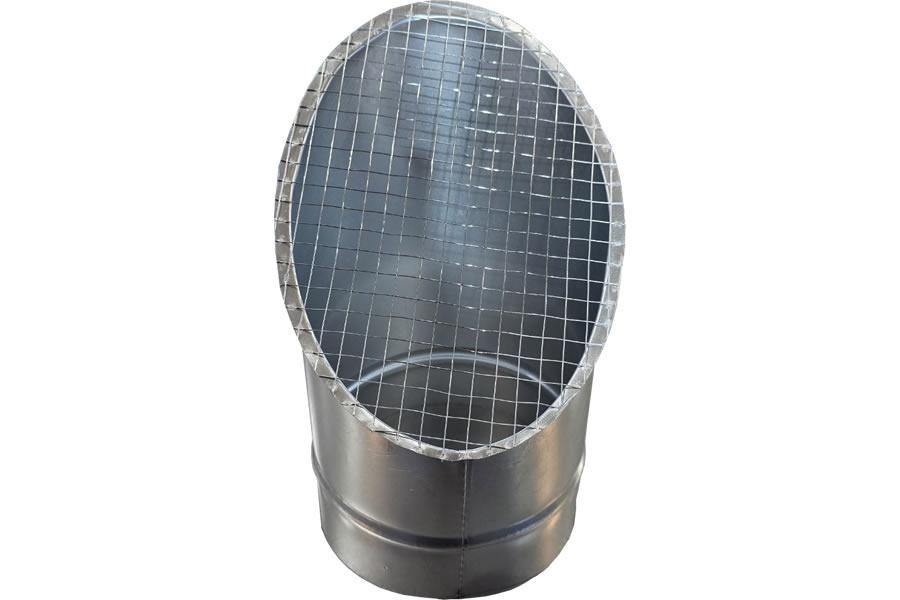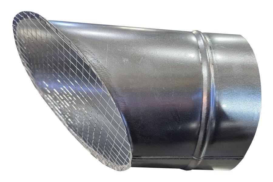 Косой или скошенный участок воздуховода круглого сечения с сварной сеткой предназначен для выхода систем приточной/вытяжной вентиляции. Отверстие оснащено защитной сеткой и изготовлено из оцинкованной стали. Выходная часть имеет наклон для защиты системы от дождя, снега и других атмосферных осадков.
